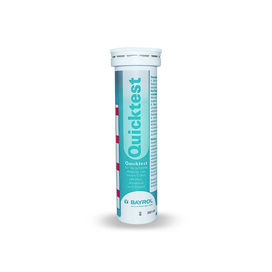 Bayrol Quick-Test zur Bestimmung von ph-Wert, freies Chlor, Alkalinität und Gehalt an Algizid.