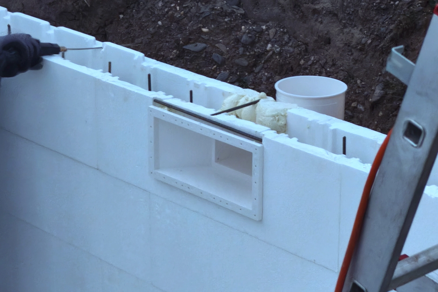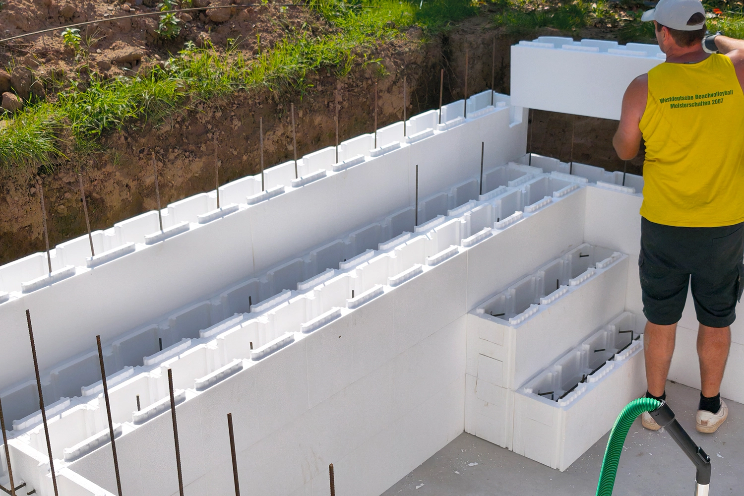 Das Befüllen der Steine mit Beton ist mühsam,da man die Styroporsteine nicht mit Druck befüllen kann. Hier hilft es mehrere Personen zur Unterstützung zu haben