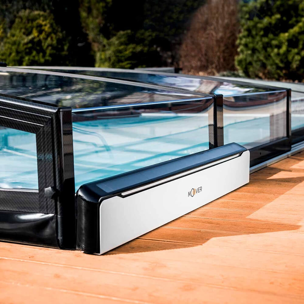 Eines der herausragendsten Merkmale des MOOVER ist, dass er sich durch Solarbetrieb aufladen kann, was es zu einer umweltfreundlichen Lösung für Ihre Poolüberdachung macht. Dadurch wird die Abhängigkeit von elektrischer Energie verringert! In Zeiten, in denen die Sonneneinstralung nicht ausreicht, kann das System mit Netzaufladung betrieben werden.