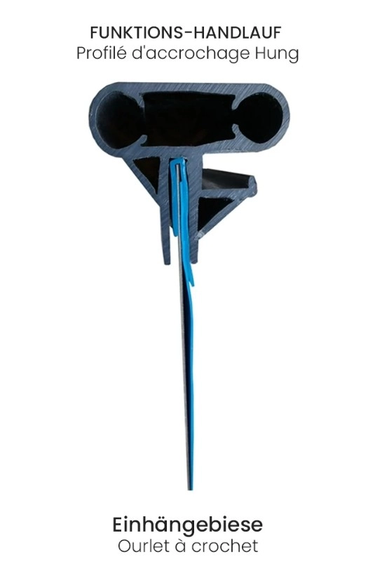 - Keilbiese (Biese P3): Die keilförmige Ausführung wird in ein Profil des Funktionshandlaufs eingeklemmt – ideal für eingelassene Pools mit Randsteinen. Ein Wechsel ist auch ohne Demontage des Handlaufs möglich. Haben Sie einen Stahlwand Pool mit Funktionshandlauf und möchten die Folie wechseln, so können Sie die alte P1 Folie mit Einhängebiese direkt unter dem Funktionshandlauf abschneiden und die neue P3 Folie mit Keilbiese einhängen.