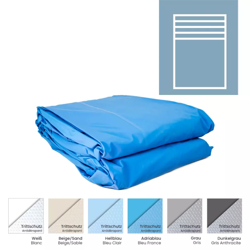 Ihre neue Poolfolie ist eine Spezialanfertigung aus Frankreich. Werfen Sie einen Blick auf die Farbauswahl oben, ob Ihre Wunschfarbe und -stärke lagernd ist, oder die Poolfolie erst angefertigt werden muss.