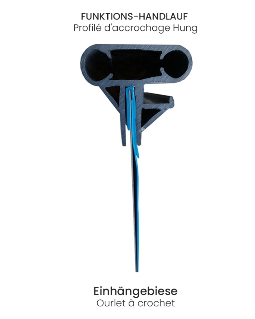 - Einhängebiese (Biese P1): Eine verstärkte Falte in der Folie wird wie ein Haken an der Stahlwand eingehängt. Der Standardhandlauf sorgt für zusätzliche Stabilität. Diese Biesenart wird meist beim Erstkauf von Stahlwandpools mitgeliefert.