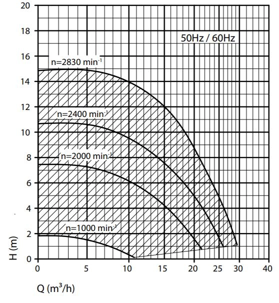 Drei Drehzahlwerte sind voreingestellt (2.000, 2.400 und 2.800 U/min). Die Drehzahl kann aber auch händisch zwischen 1.000 und 2.850 U/min frei eingestellt werden. Bei der niedrigsten Drehzahl fördert die Pumpe 10 m³/h, bei der höchsten bis zu 21 m³/h bei 8 m WS.