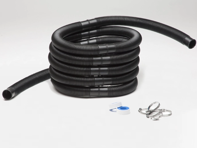 - Anschlusszubehör – bestehend aus Druckschlauchtüllen, Schlauchklemmen, 6 m Schlauchpaket Ø 38 mm und Teflonband