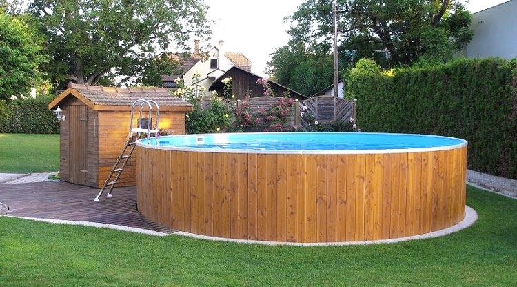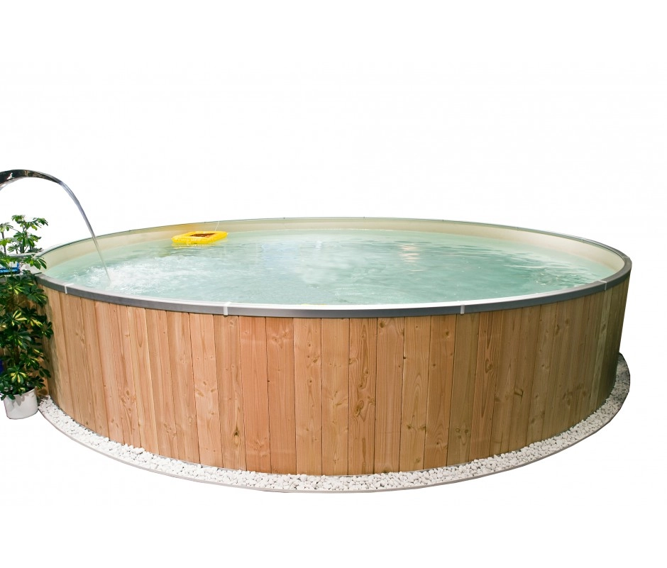 Der doppelwandige Holzpool FUN WOOD aus hochwertiger Stahlwand und einer naturbelassenen Holzverkleidung aus Douglasie, sowie dem weiterentwickelten unverwüstlichen Alu-Kombi-Handlauf.
