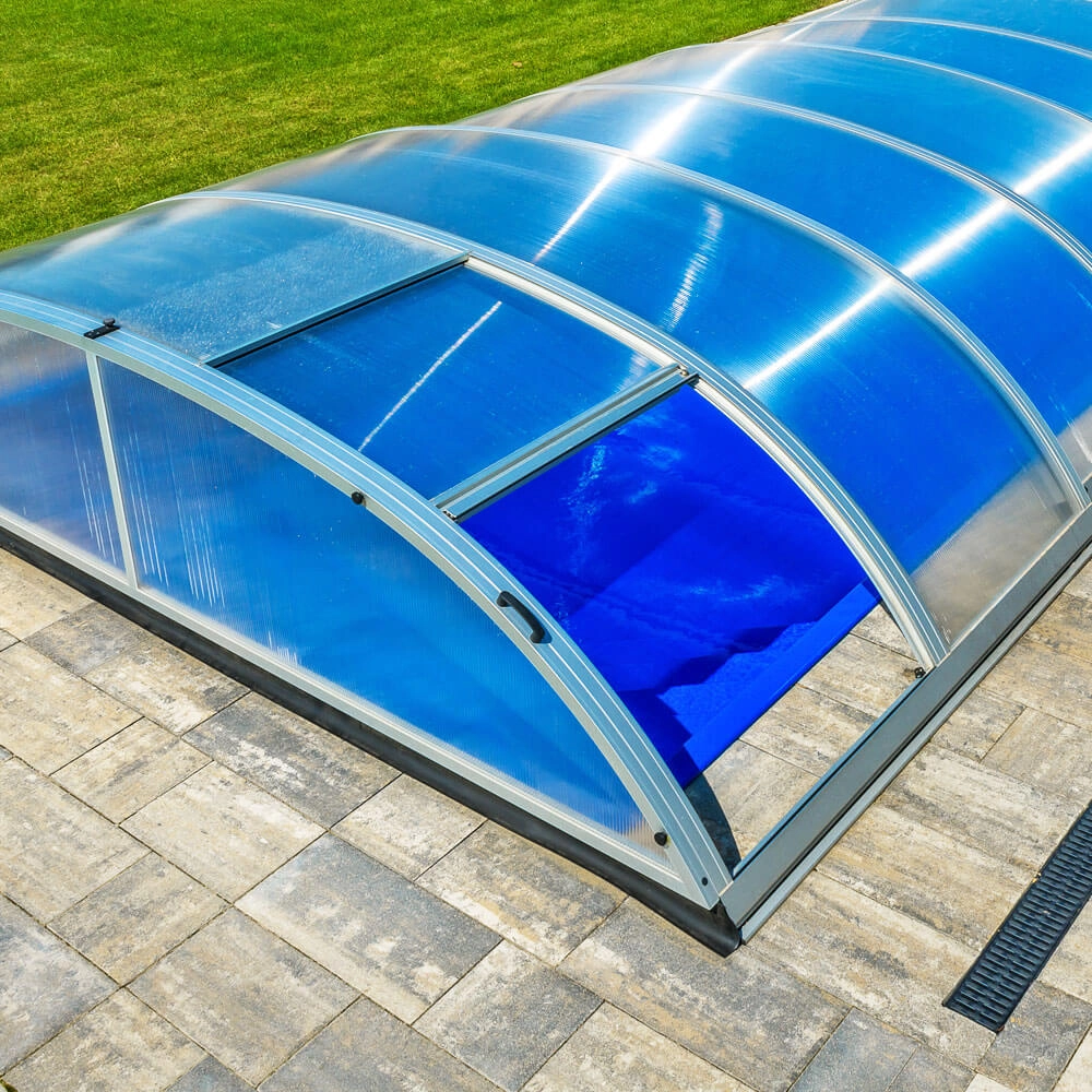 Wenn Sie im Sommer Frischluft genießen möchten, kann die Überdachung schnell und einfach komplett geöffnet werden. Die mitgelieferte Schienenverlängerung ermöglicht es Ihnen die Überdachung komplett hinter den Pool zu schiebe.