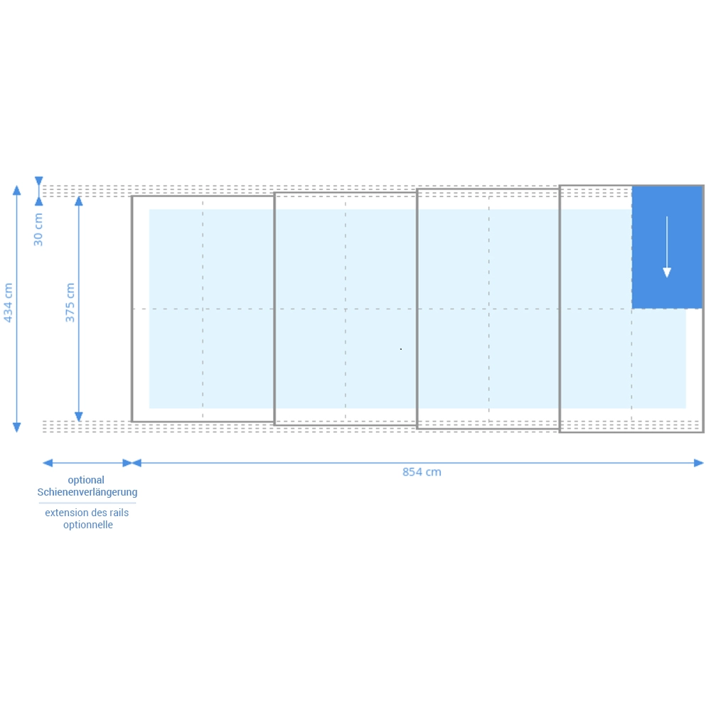 Wenn Sie im Sommer Frischluft genießen möchten, kann die Überdachung schnell und einfach komplett geöffnet werden. Die mitgelieferte Schienenverlängerung ermöglicht es Ihnen die Überdachung komplett hinter den Pool zu schiebe.