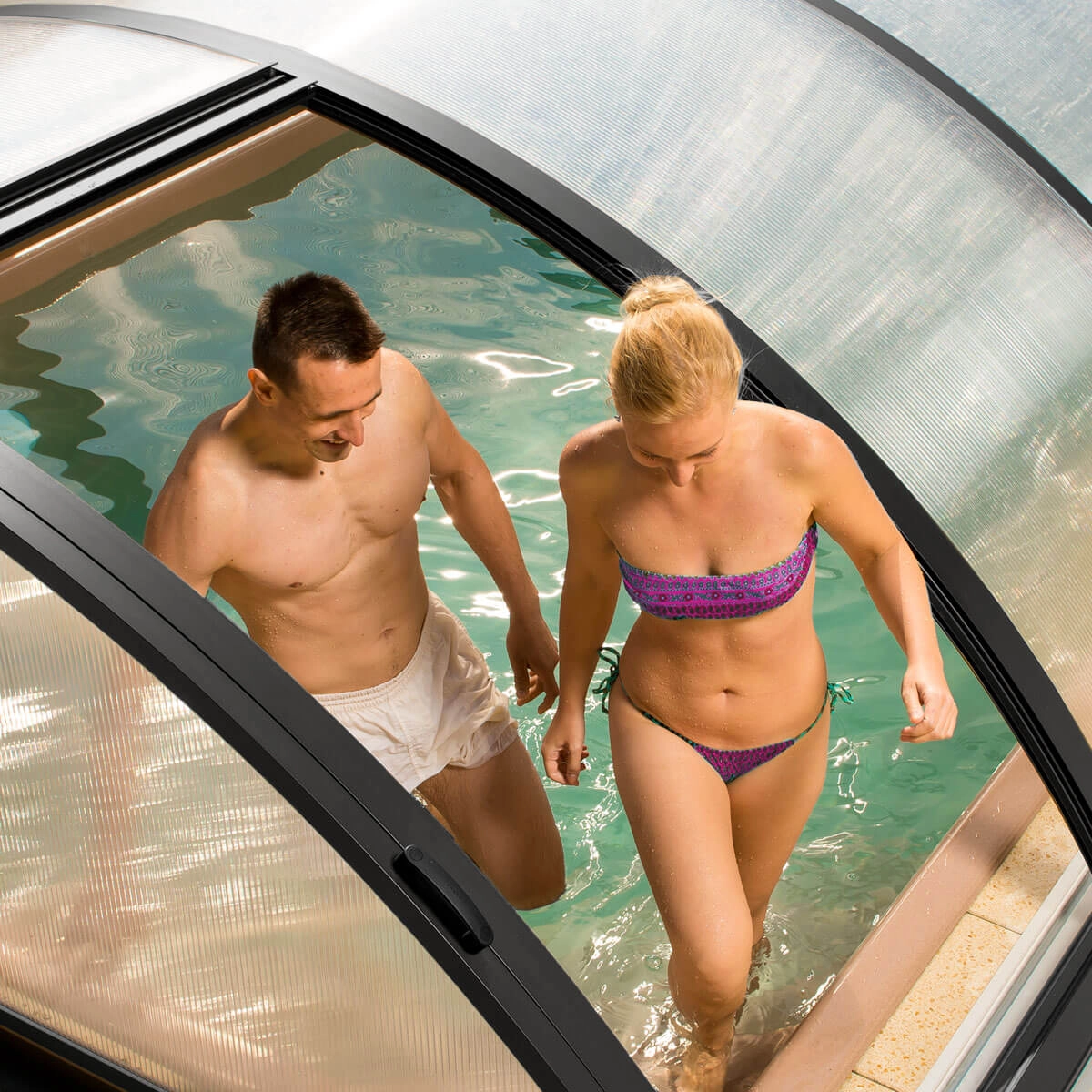 Das Pooldach ermöglicht es Ihnen die Wärme des Pools zu behalten und gleichzeitig Schwimmen zu gehen. Die Entscheidung, ob Sie den Pool mit einer Solarplane vor einem Wärmeverlust schützen wollen, oder Schwimmen gehen möchten, muss nicht mehr getroffen werden. Auch der Poolroboter kann jetzt den Pool reinigen, ohne dass Wärme verloren geht - dank geschlossener Überdachung. Dadurch, dass die Wärme besser erhalten bleibt, können Sie auch in der Nebensaison schwimmen gehen.