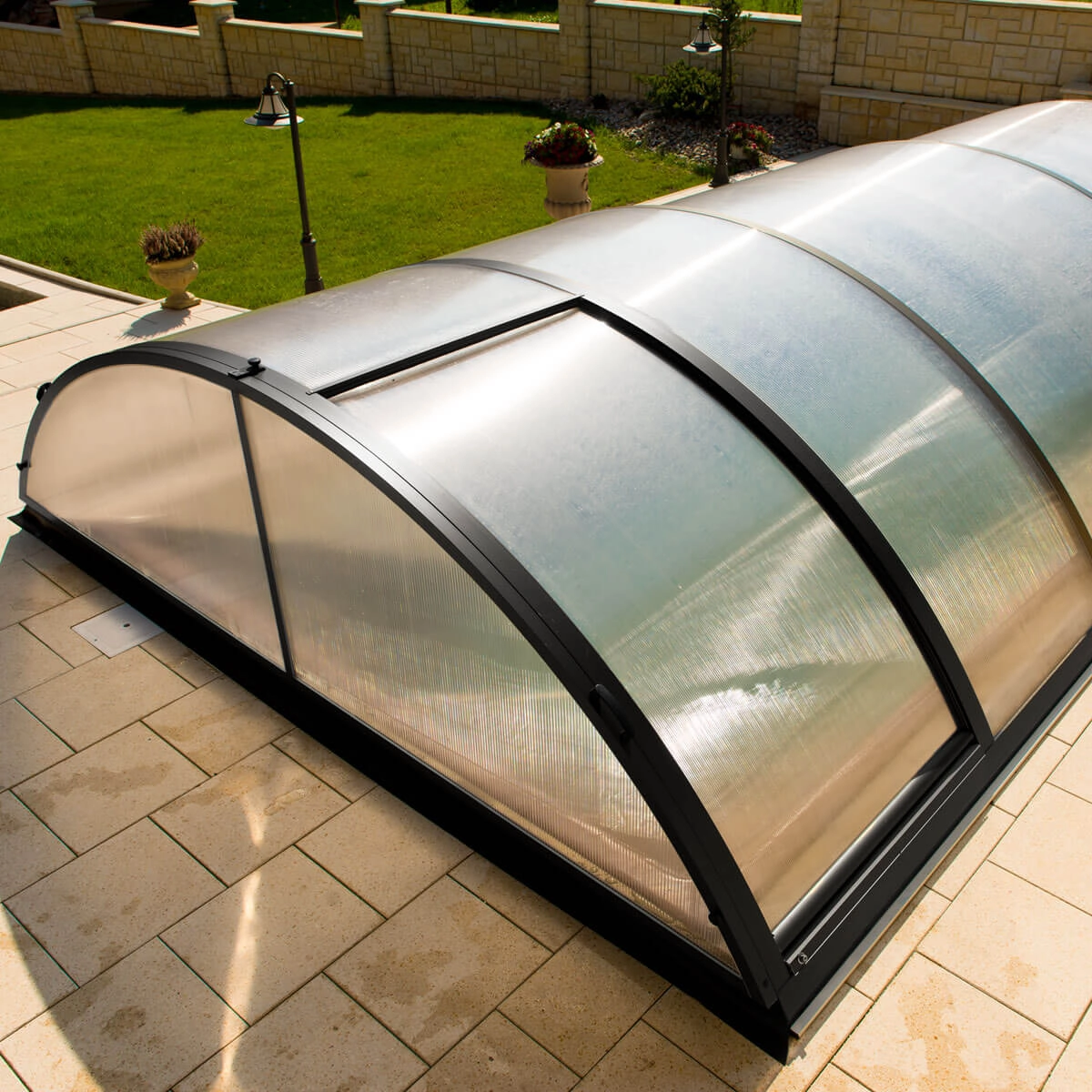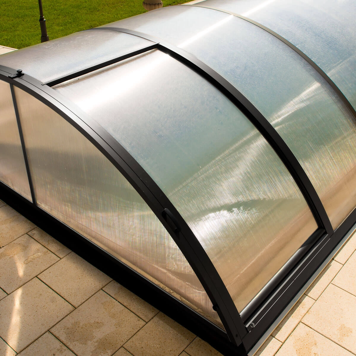 Wenn Sie im Sommer Frischluft genießen möchten, kann die Überdachung schnell und einfach komplett geöffnet werden. Die mitgelieferte Schienenverlängerung ermöglicht es Ihnen die Überdachung komplett hinter den Pool zu schiebe.