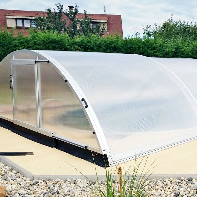 Wenn Sie im Sommer Frischluft genießen möchten, kann die Überdachung schnell und einfach komplett geöffnet werden. Die mitgelieferte Schienenverlängerung ermöglicht es Ihnen die Überdachung komplett hinter den Pool zu schiebe.