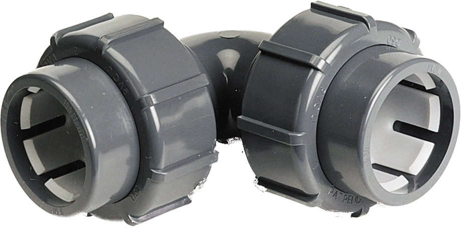 PVC Übergangswinkel 90°, Ø 50 Klemm x Ø 50 Klemm, Flexfit Verbindungsteile für Flex-Schläuche. Die Weich-PVC-Klebeschläuche werden mit diesen Fittings nicht mehr verklebt, sondern mit der Spezial-O-Ring-Verschraubung wasser- und druckdicht verklemmt.