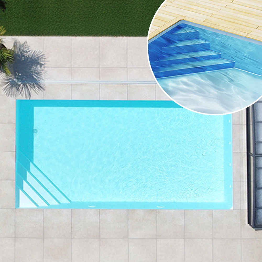 Das Set enthält die ultrastarken Thermostone® Styroporsteine, exklusiv von Apoolco entwickelt und gefertigt, sowie die hochresistente Apoolco Premium STRONG Poolfolie, die selbst integrierte Treppen mühelos in einem Stück zulässt.