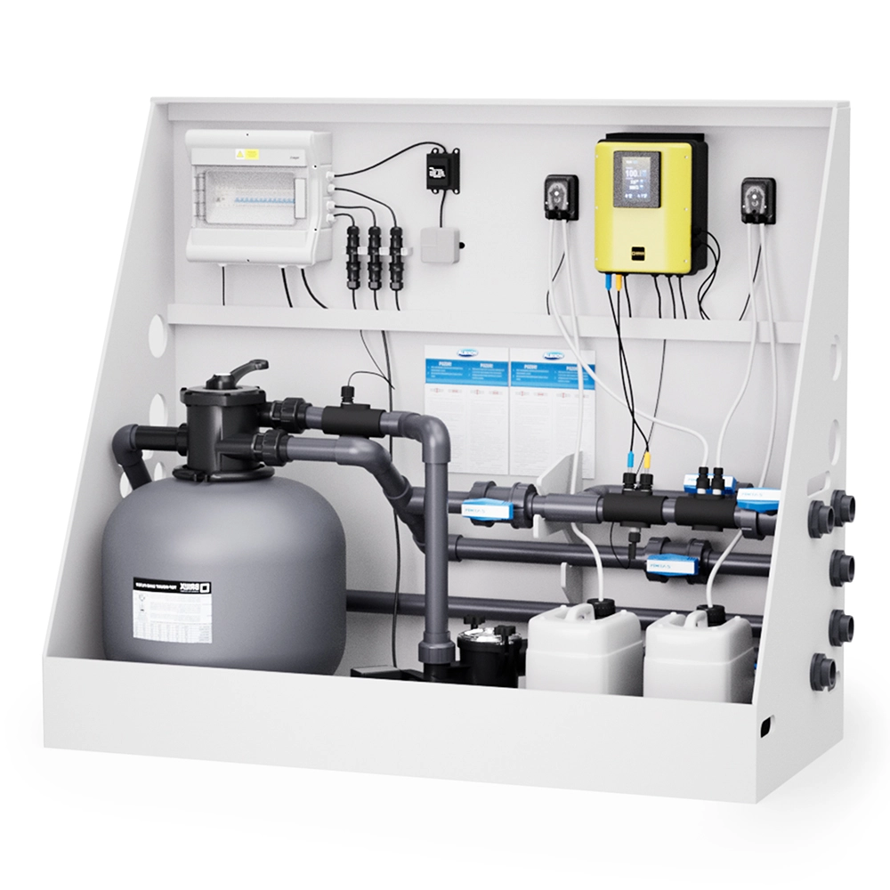 Die Albixon Technikwand STATION sorgt für eine zuverlässige und unkomplizierte Pflege Ihres Pools. Sie stellt den Wasserkreislauf, die Filtration und Desinfektion sicher und bietet dabei eine einfache Bedienung und einen schnellen Zugriff auf die Technik. Diese Lösung eignet sich sowohl für die Aufstellung in der Garage als auch im Gartenhaus – ganz nach Ihren Wünschen.